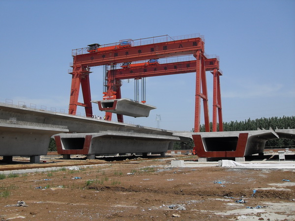 該設備既可兩臺配合抬吊預制梁,也可以單臺起重機配雙吊具起吊預制梁,兩臺同時起重的提梁機各自的起重量一般為450噸,單臺起重的提梁機起重量通常可達900噸。它配置支腿行走、天車行走及天車起吊設備,可以實現(xiàn)全方位機械化動作。主要用于將預制梁從制梁臺提吊至存梁臺位,預制梁養(yǎng)護完成后將其從存梁臺位吊運到運梁車上。作為起重設備完成架橋機的組裝和拆卸。還用于架設墩身不高的旱橋。
